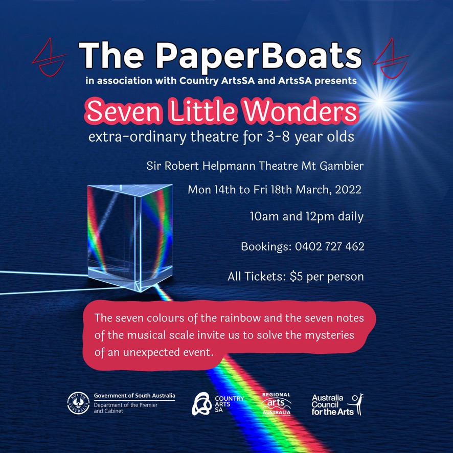 SEVEN LITTLE WONDERS ~ a poetic visual theatre performance for 3-8 year olds by artists, Gavin Clarke, Sarah Brokensha and Anya McKee working with Dave Brown and Bob Weatherly through The PaperBoats in association with Country ArtsSA and ArtsSA.